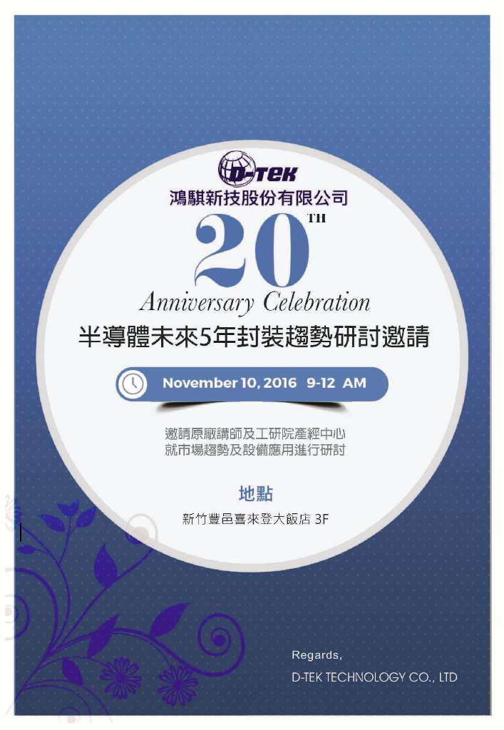 | 鴻騏新技將於10 Nov. 2016 假 新竹豐邑喜來登大飯店舉辦 20週年慶活動之半導體未來五年封裝趨勢研討會,地址為:新竹縣竹北市光明六路一段265號三樓,會後將有抽獎與餐敘活動,期待 貴客來賓們大駕光臨。