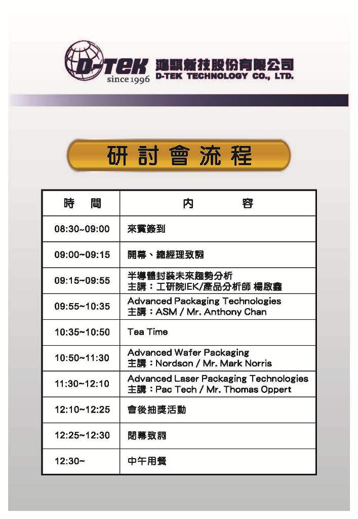 | 鴻騏新技將於10 Nov. 2016 假 新竹豐邑喜來登大飯店舉辦 20週年慶活動之半導體未來五年封裝趨勢研討會,地址為:新竹縣竹北市光明六路一段265號三樓,會後將有抽獎與餐敘活動,期待 貴客來賓們大駕光臨。